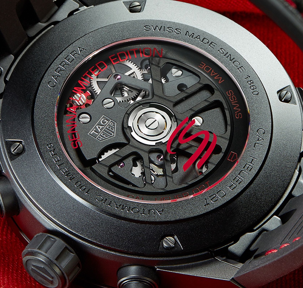 Strojek se odhaluje přes safírové prosklení dýnka, jemuž vévodí známé červené S, tedy logo Ayrtona Senny.