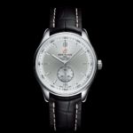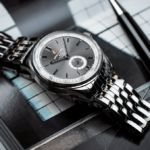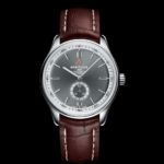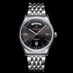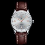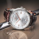 Zatímco apertura datumky je na pozici 6, obloukový průhled na druhý věnec je pak u dvanáctky. Zaplatily za to tři hodinové indexy. Zbylých devět má, stejně jako trojic ruček, zlacený povrch. Tento model přichází ve dvou verzích: s hnědým řemínkem a stříbrným číselníkem (106 600 Kč) a sedmiřadým ocelovým náramkem a černým číselníkem (114 400 korun).