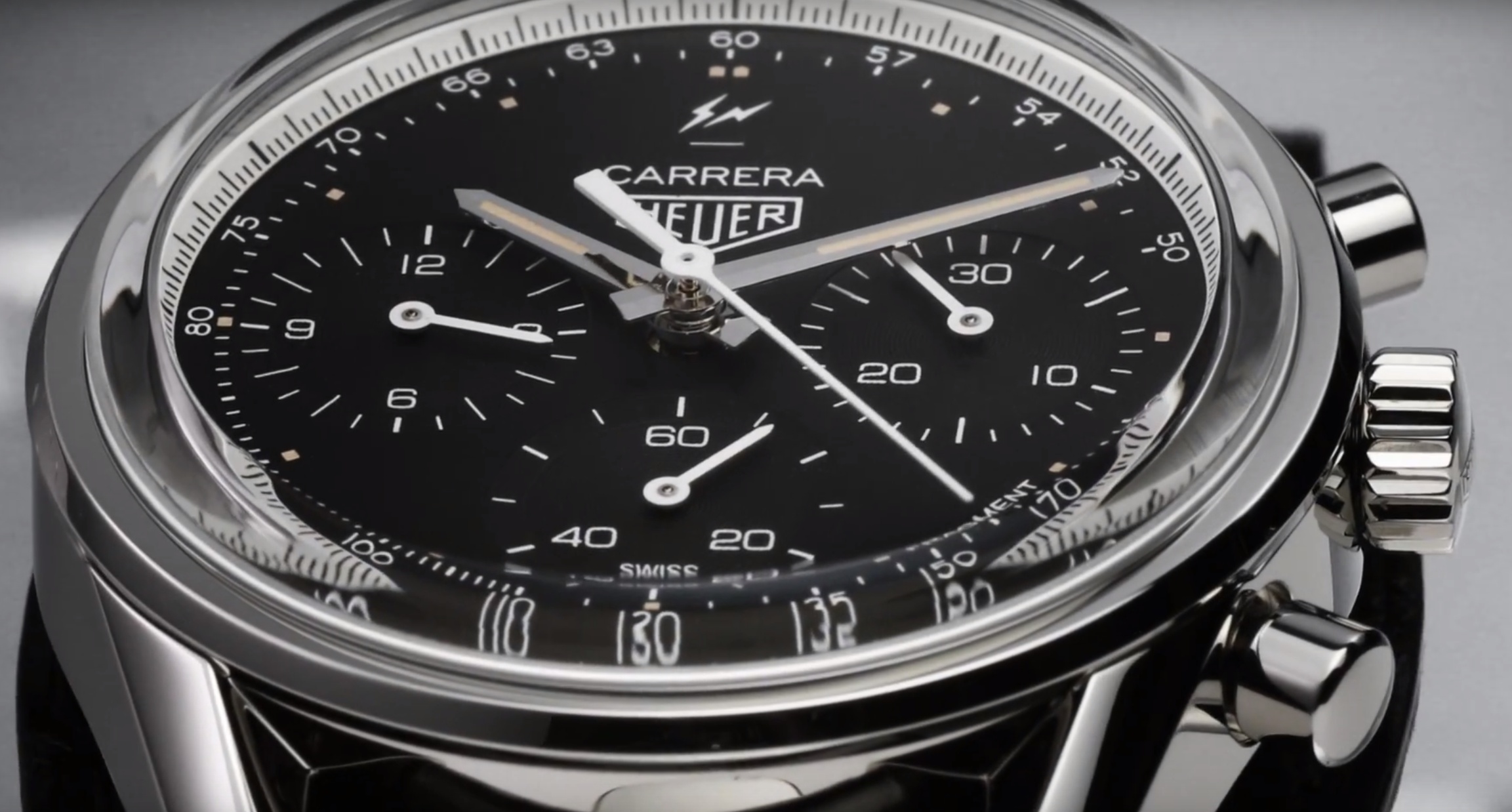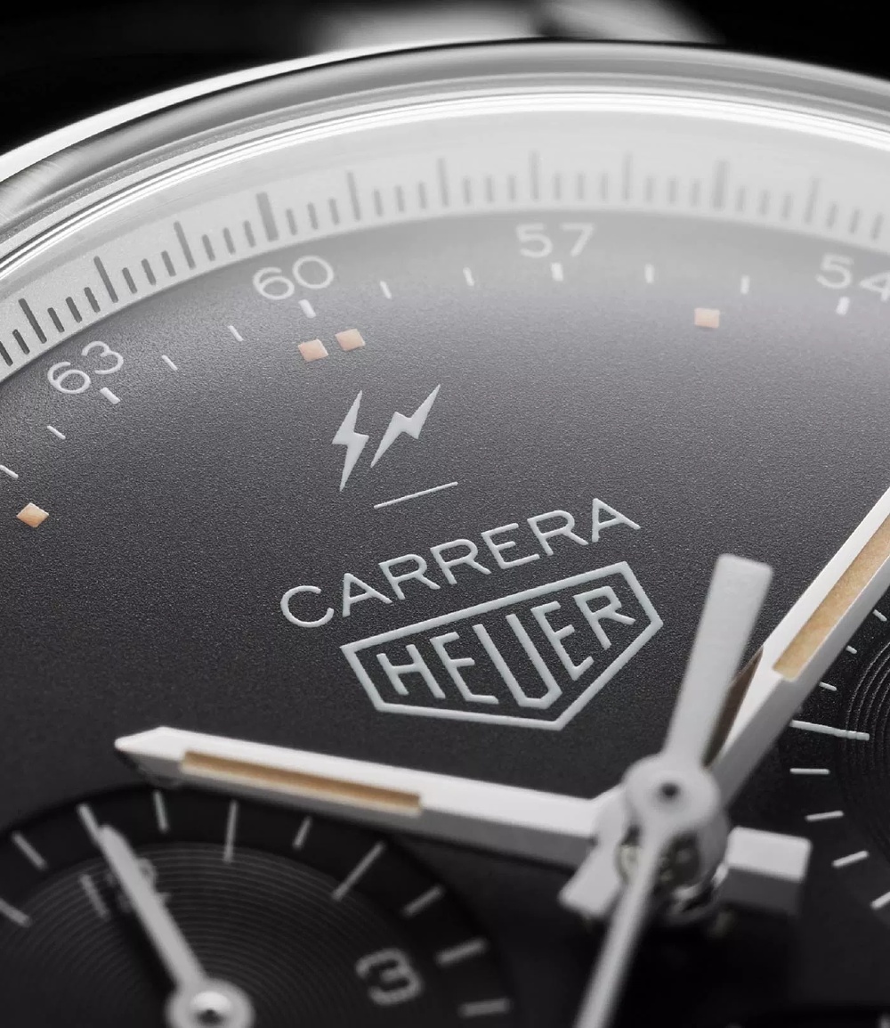 Jednou z diferencí je symbol dvojitého blesku, jež v horní části doplňuje nápis “Carrera” a vintážní logo Heuer.