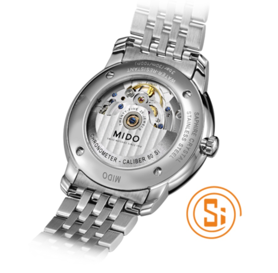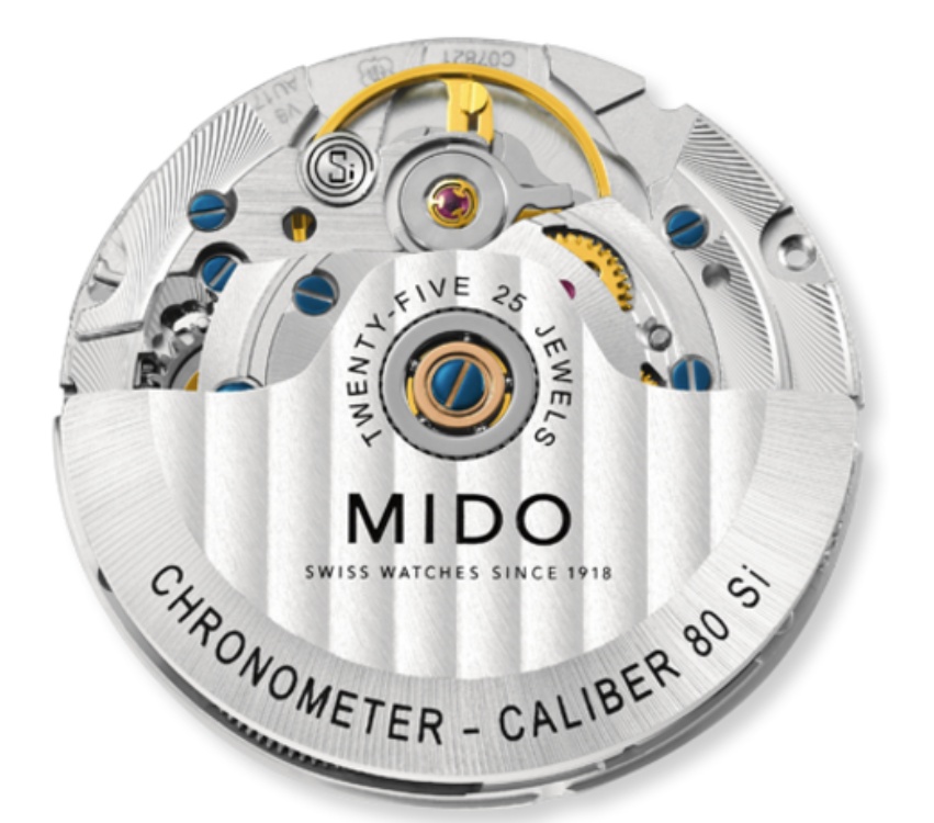 Caliber 80 vychází ze strojku ETA C07.821, má průměr 11 1⁄2’’’ (25,60 mm), tloušťku 5,22 mm a obsahuje 25 rubínů. Stejně jako vůbec první 80hodinový derivát kalibru ETA 2824 (C07.111) i oscilátor této iterace vykonává 21 600 kyvů/h (3 hz). Vlásek je tedy křemíkový, na což Mido upozorňuje drobným diskem se značkou Si na můstku vedle setrvačky.